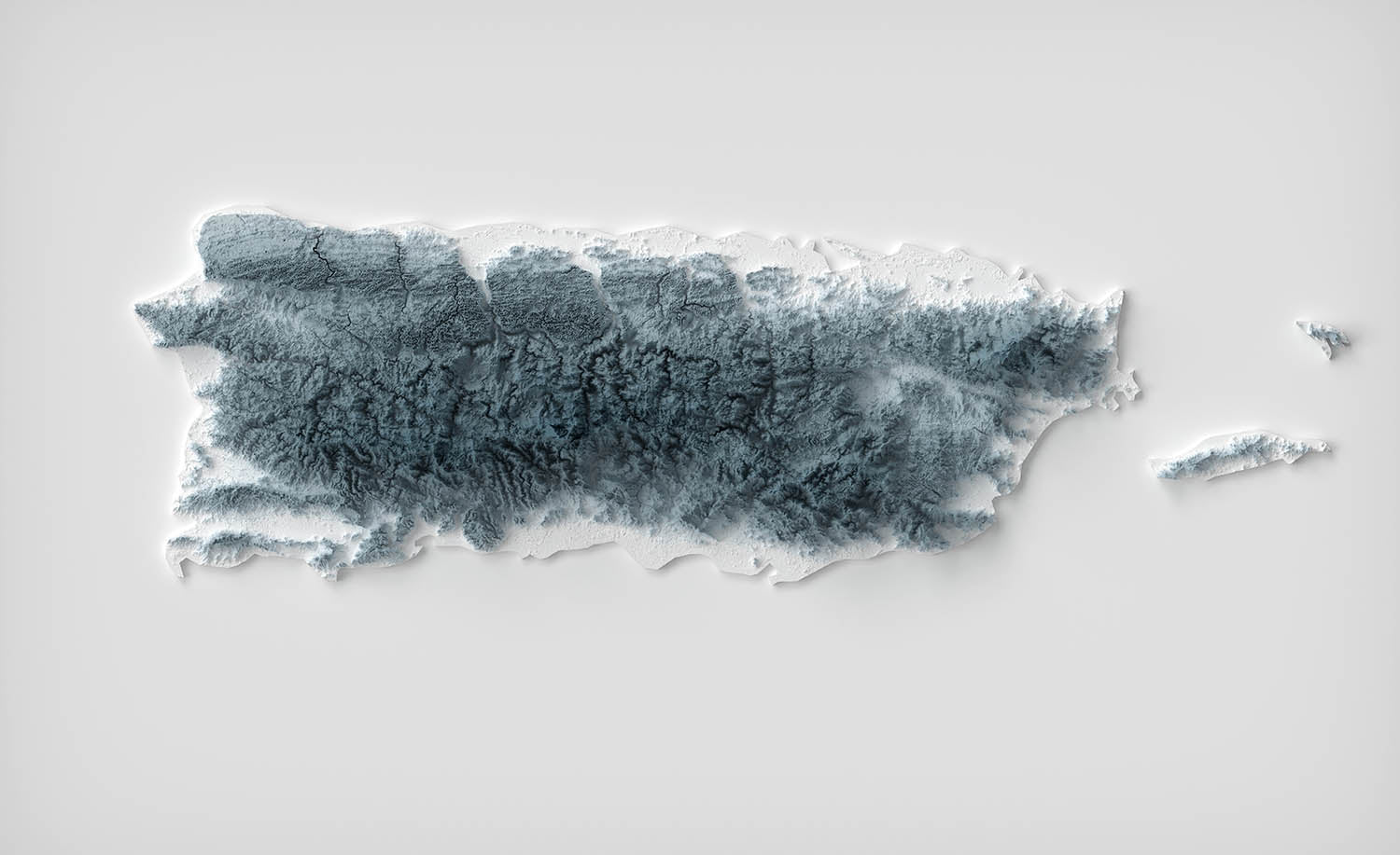 En bordure de l'île principale, les petites îles de Vieques et Culebra peuvent être vues comme des formes modestes et surélevées, séparées dans un relief tranquille, indiquant leurs altitudes plus basses et leurs profils lisses. Tout au long de la carte, l'utilisation soignée de l'ombre et des accents met en évidence le contraste dynamique entre l'intérieur accidenté et les côtes plus douces, permettant à chaque vallée, crête et montagne d'émerger avec une clarté tactile.