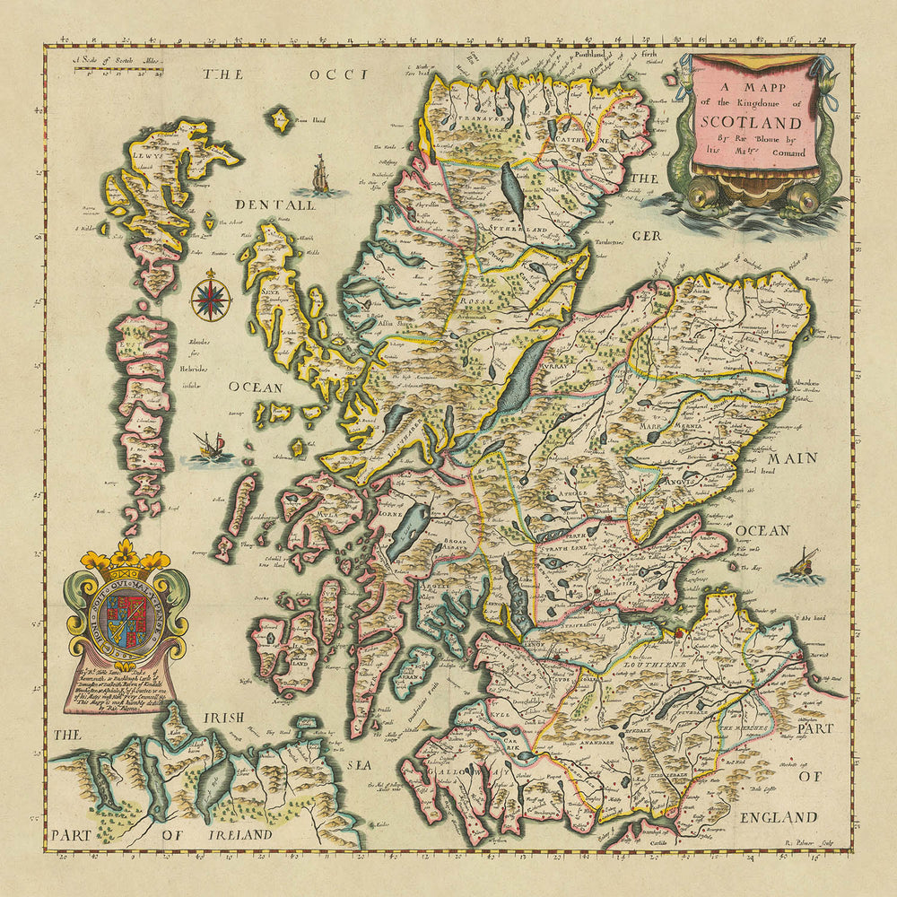 - Une des premières cartes gravées et publiées de l'Écosse produites dans les îles britanniques, datant de 1670.