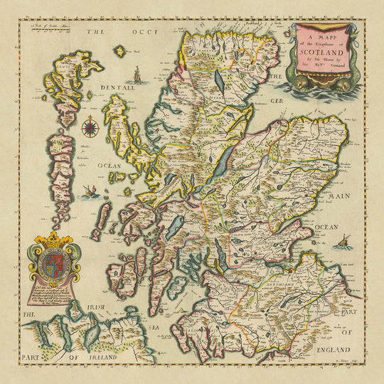 La carte elle-même est une fenêtre fascinante sur le paysage politique et physique de l'Écosse du XVIIe siècle. Chaque comté et région historique est clairement délimité, avec des frontières nettement définies pour refléter le patchwork complexe de la gouvernance écossaise. Les Highlands, avec leur relief ombragé, s'élèvent de manière spectaculaire au nord et à l'ouest, tandis que les Lowlands sont gravées de rivières et de vallées fertiles. Les grands plans d'eau tels que la mer du Nord—ici étiquetée comme l'océan allemand—la mer d'Irlande, et les emblématiques estuaires de Forth et Clyde, encadrent le royaume et évoquent l'héritage maritime de l'Écosse. Le Loch Lomond et le Loch Ness, légendaires pour leur beauté naturelle et leur folklore, sont également mis en avant.