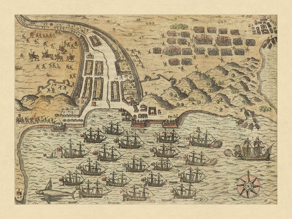 Au-delà de son attrait esthétique, cette carte sert de document historique crucial, éclairant les tensions géopolitiques plus larges de la fin du XVIe siècle. L'expédition de Drake était une déclaration audacieuse contre la domination espagnole, révélant les insuffisances de leurs défenses côtières. La représentation des mouvements de troupes et des fortifications de la carte offre des aperçus inestimables sur les stratégies militaires employées lors de ce raid audacieux. Elle se dresse comme un récit visuel d'une époque où les empires s'affrontaient en haute mer, modifiant à jamais le cours de l'histoire.