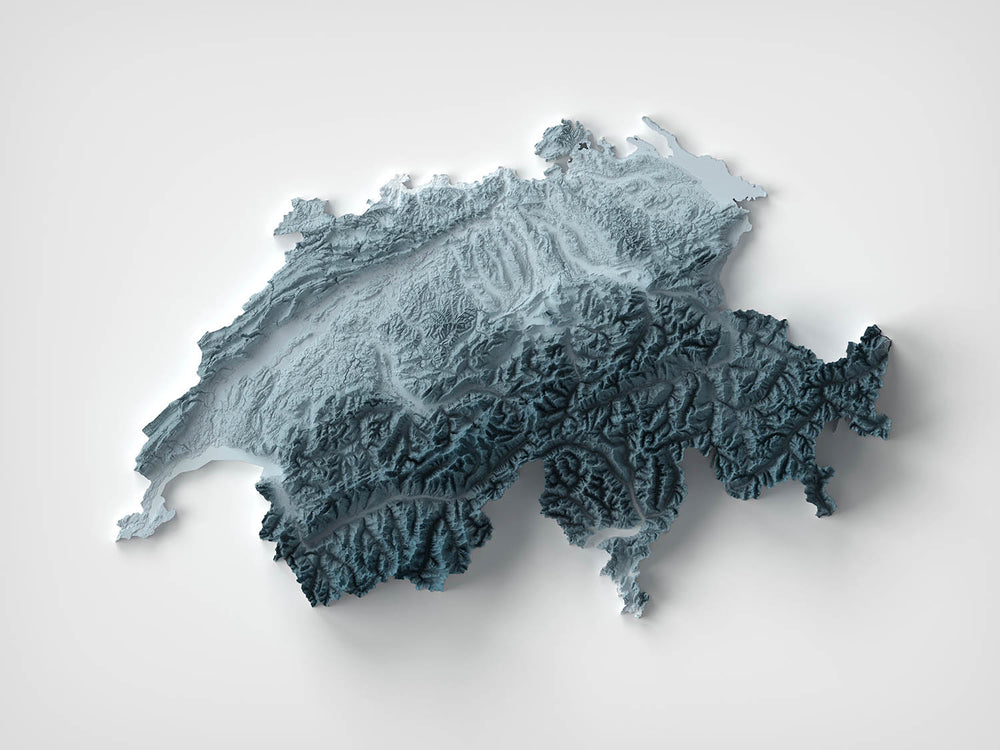 Les célèbres lacs de Suisse—comme Genève, Zurich et Lucerne—sont nichés comme des joyaux au milieu du terrain varié, leurs surfaces lisses dessinées dans le paysage entre les flancs des montagnes. Le modelage subtil de la carte fait ressortir ces bassins, soulignant la profondeur et la clarté des vallées qui les bercent. Les ombres profondes le long des rives illustrent les chutes abruptes de la terre vers l'eau, surtout là où les lacs sont entourés par des falaises abruptes.