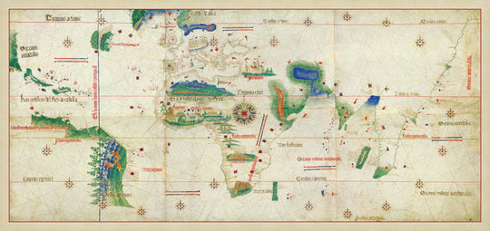 Le Planisphère Cantino, réalisé en 1502 par un cartographe portugais anonyme, est un chef-d'œuvre de l'histoire cartographique. Cette carte exquise capture le monde tel qu'il était nouvellement révélé aux explorateurs européens à l'aube de l'ère des découvertes. Elle reflète les voyages ambitieux qui ont élargi les horizons de l'Europe, mettant en avant des terres nouvellement découvertes et des routes maritimes vers les Amériques, l'Afrique et l'Inde. La carte est nommée d'après Alberto Cantino, un diplomate italien qui l'a acquise, et elle reste l'un des documents cartographiques les plus précieux de son époque.