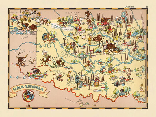 - Illustrations de bovins et de scènes de ranch, mettant en évidence l'économie agricole et d'élevage de l'Oklahoma.