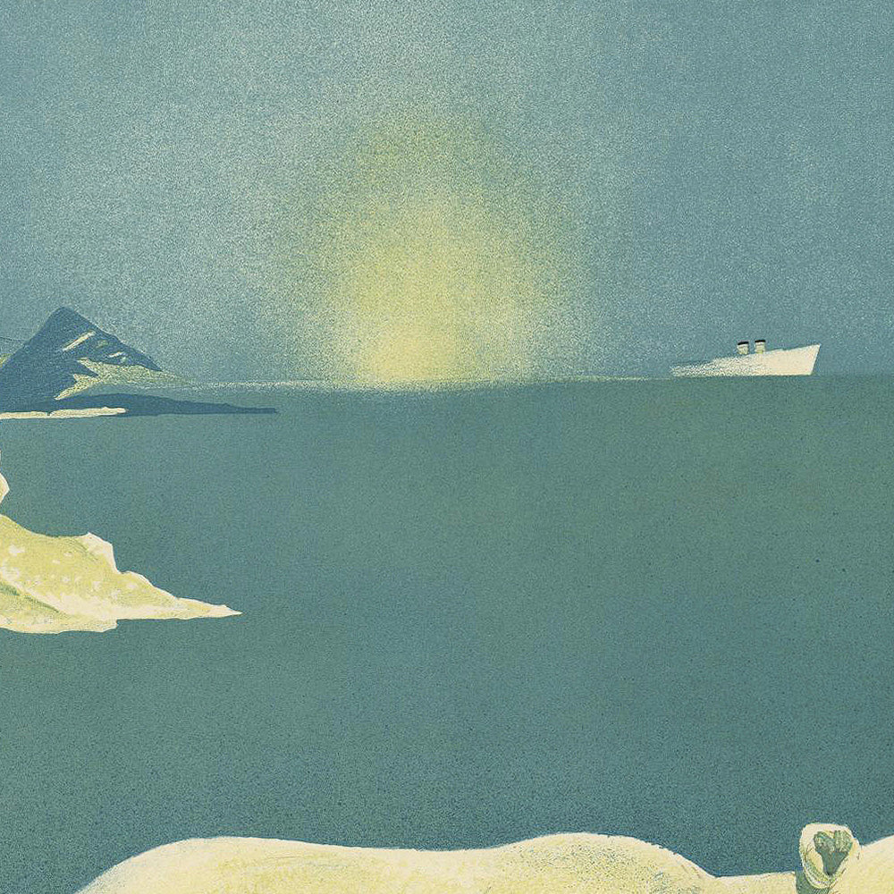 Visually, the poster’s restrained palette does the heavy lifting: whites and deep marine blues communicate salt air and open water, while accents of yellow suggest a high-latitude sun cutting through crisp northern skies. The typography is assertive yet elegant, typical of 1930s poster craft, and the simplified forms convey both the mass of an ocean liner and the clean planes of northern coastlines without unnecessary detail. It’s precisely this graphic economy—flat color fields, taut alignment, and a confident headline—that makes the piece so timeless on a modern wall.
