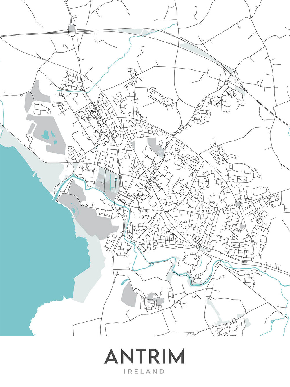 Pour ceux qui apprécient les aspects les plus raffinés de l’ameublement, cette carte offre un mélange parfait d’élégance et de sophistication. Son design moderne et son attention méticuleuse aux détails en font un complément idéal à toute collection d'art. La représentation sur la carte des quartiers animés d'Antrim et des monuments importants, tels que la tour ronde d'Antrim et le Lough Neagh, crée un sentiment de lien avec la riche tapisserie culturelle de la ville. Il rappelle le charme unique d'Antrim et la beauté de son paysage urbain, encapsulés dans une œuvre d'art à la fois intemporelle et contemporaine.