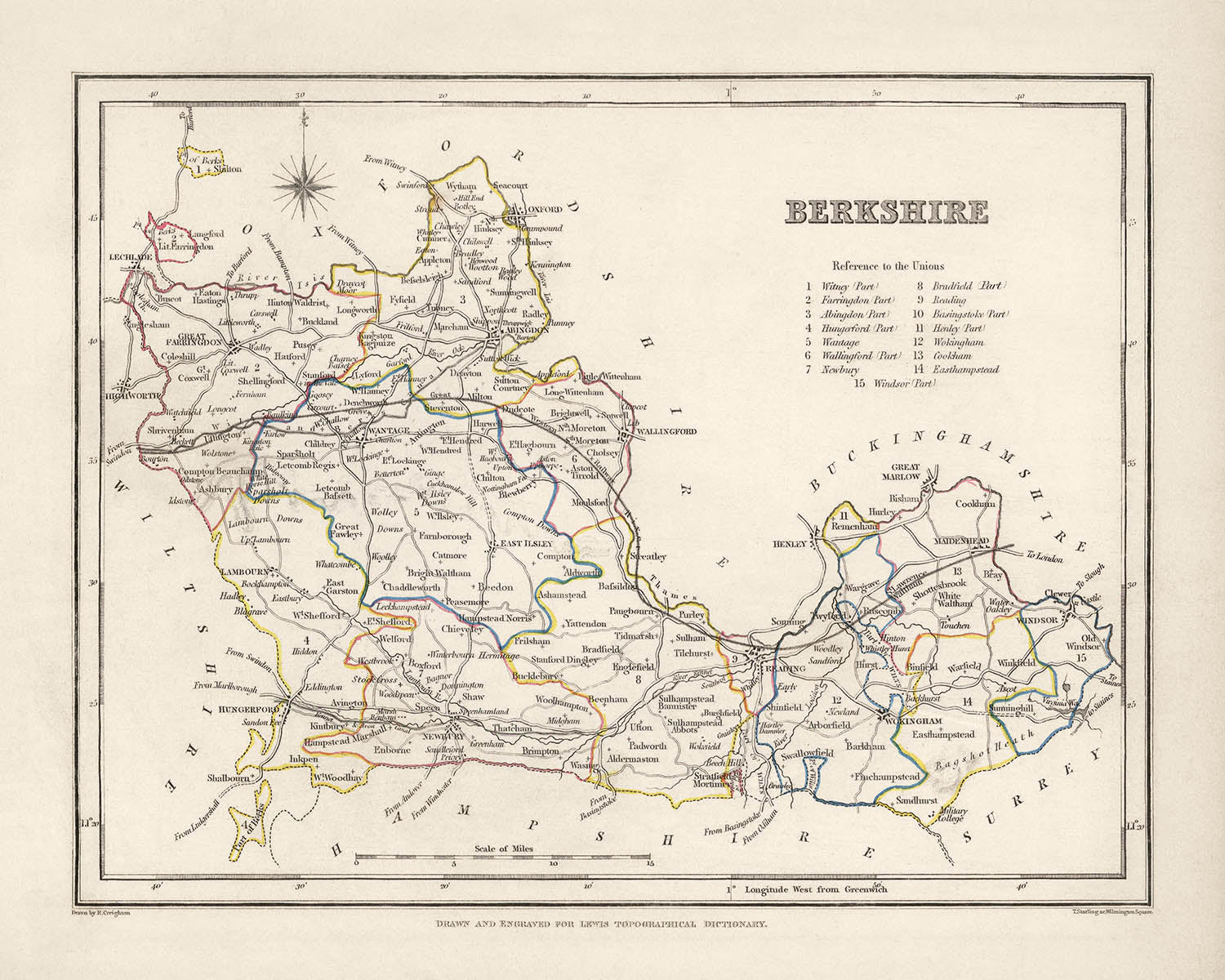 - 1844 : Publication du Dictionnaire topographique de l'Angleterre de Samuel Lewis - Samuel Lewis, le cartographe de cette carte, publie son célèbre ouvrage fournissant des descriptions détaillées des villes et des colonies à travers l'Angleterre, y compris le Berkshire.