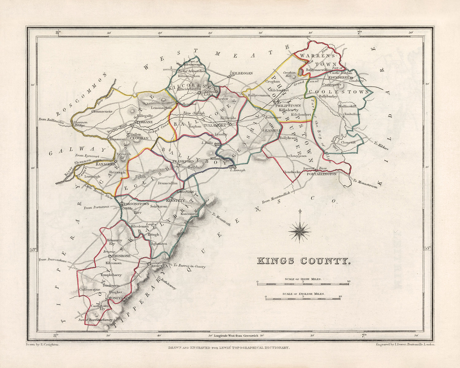 Ancienne carte du comté d'Offaly (King's) par Samuel Lewis, 1844 : Tullamore, Birr, Banagher, Clara, Edenderry
