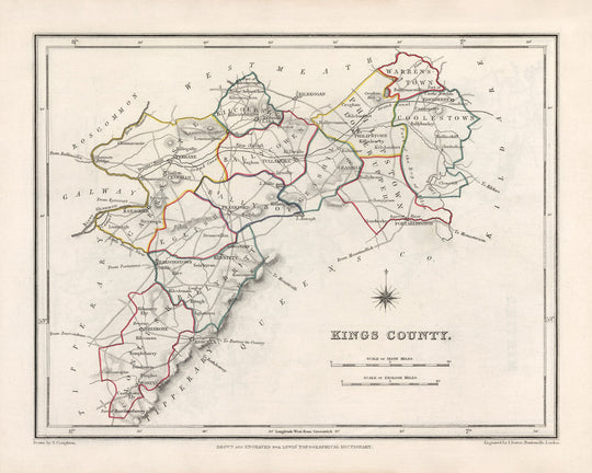 Présentant les principales villes et autres caractéristiques intéressantes du comté d'Offaly (King's), cette carte présente le riche patrimoine et les monuments remarquables de la région. Même si certaines villes modernes ne sont pas représentées sur cette carte, elle offre une occasion passionnante d'explorer des noms antérieurs et de découvrir comment le paysage a évolué au fil du temps.