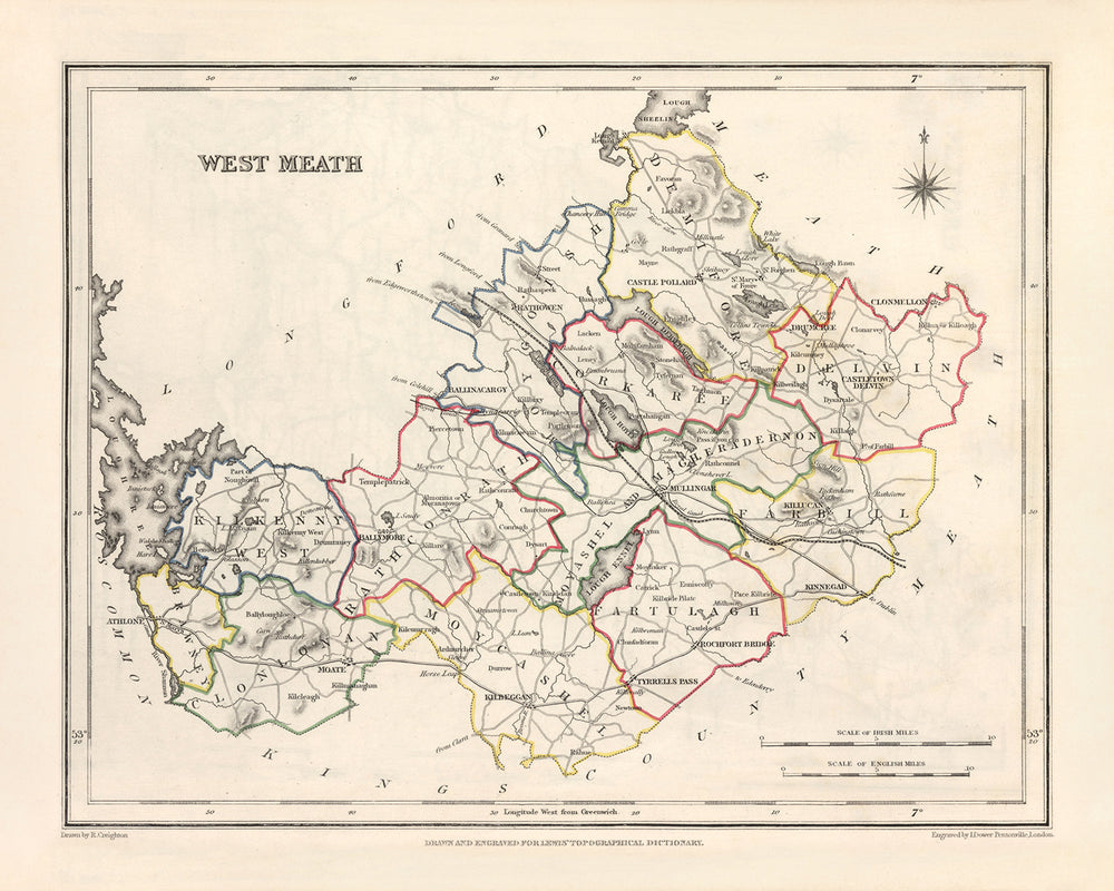 Ancienne carte du comté de Westmeath par Samuel Lewis, 1844 : Mullingar, Athlone, Kilbeggan, Moate, Fore