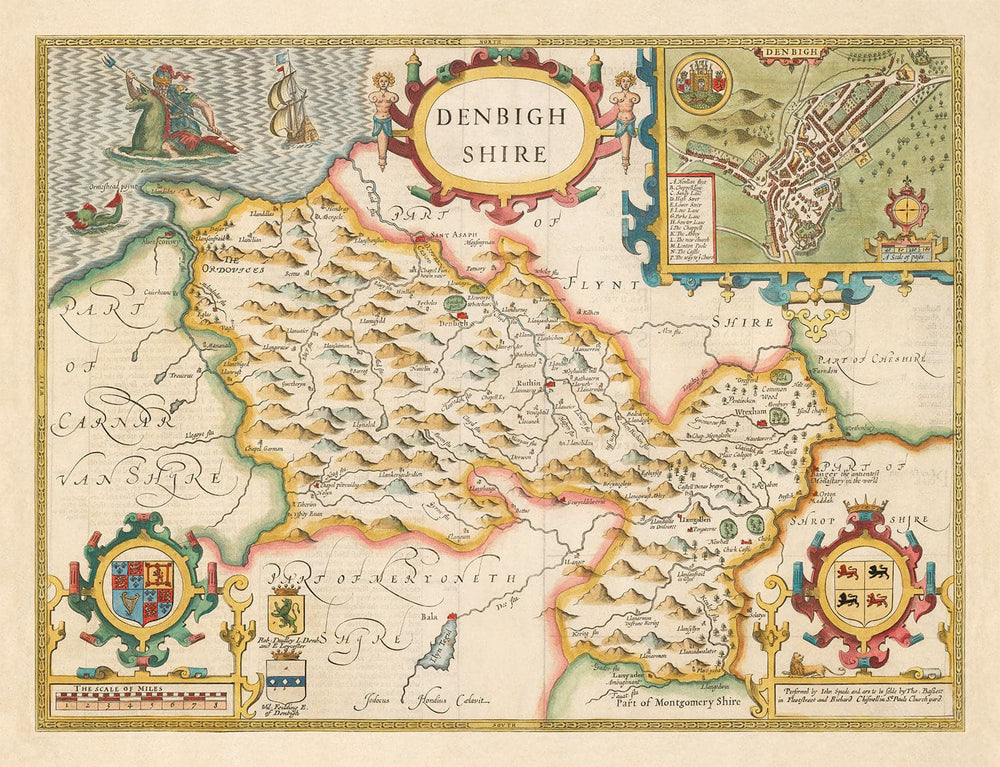 En haut à droite se trouve une gravure détaillée de Denbigh, la ville principale du comté. Notamment, Rhyl n'est pas sur cette carte - à l'époque, elle était dans le Flintshire.
