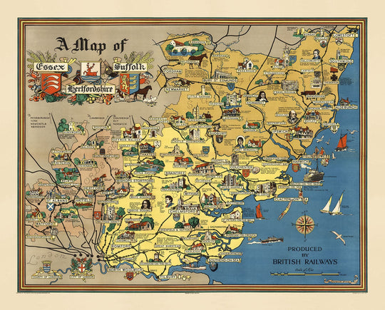 Publié en 1949 par des chemins de fer britanniques, cette belle carte picturale d'Estra Clark a été conçue pour promouvoir les voyages en train et autour du Yorkshire sur le chemin de fer nord-est.