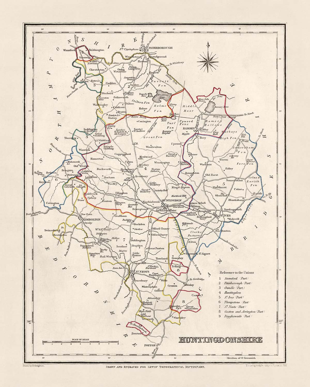 Ancienne carte du Huntingdonshire par Samuel Lewis, 1844 : St. Ives, St. Neots, Ramsey, Godmanchester et Kimbolton