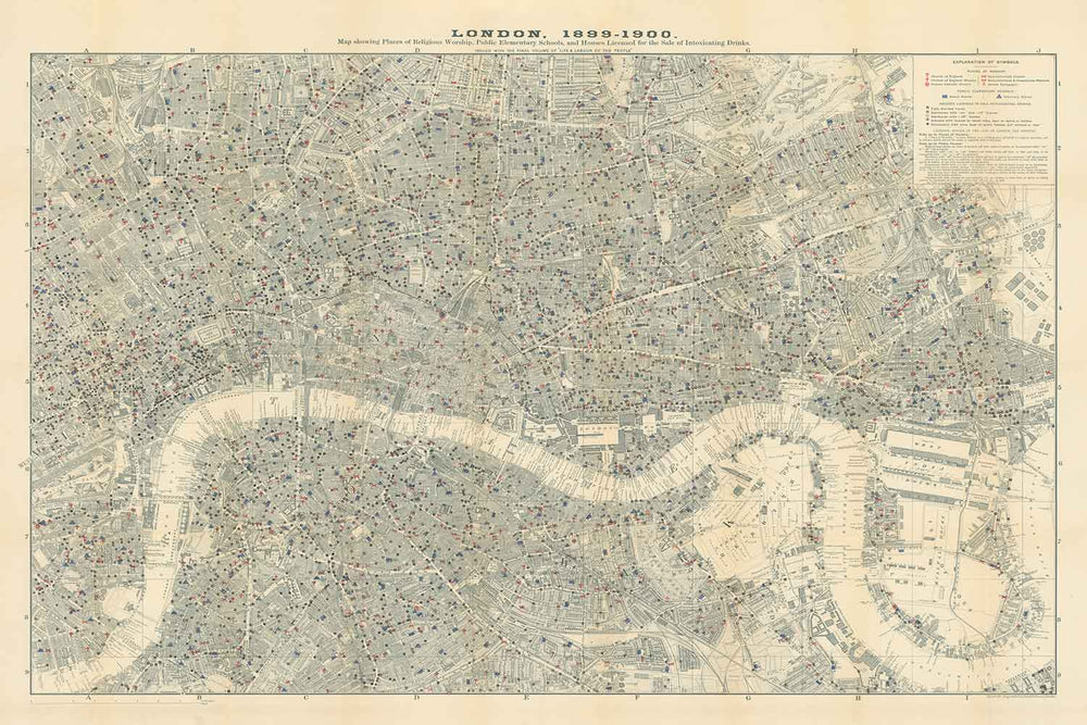 Ancienne carte des églises, pubs et écoles de Londres en 1903 par Charles Booth: Westminster, City of London, Southwark, Isle of Dogs