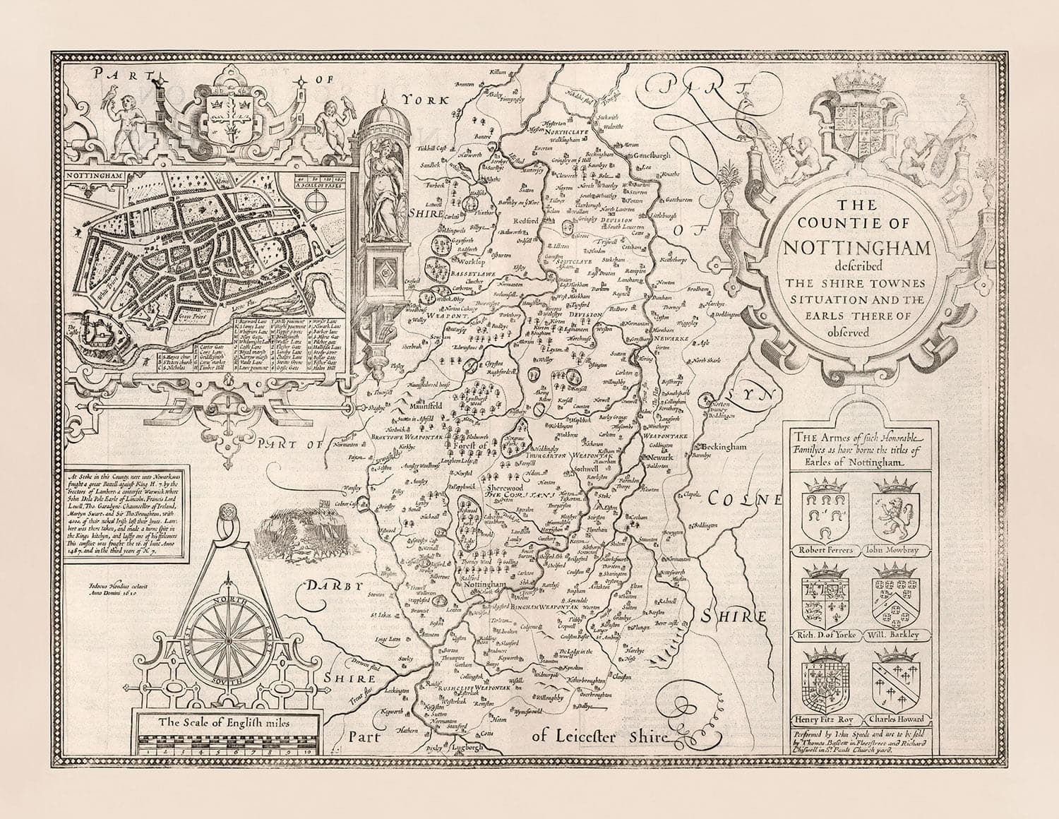 Ancienne carte de Nottinghamshire, 1611 par John Speed - Nottingham, Mansfield, Newark, Travaquage, Sherwood Forest