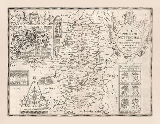 Dans le coin supérieur gauche se trouve une belle gravure détaillée de la ville de Nottingham. Et bien sûr, vous pouvez voir la forêt de Sherwood (célèbre grâce à Robin des Bois) juste au nord de Nottingham... où vivait ce vilain shérif !