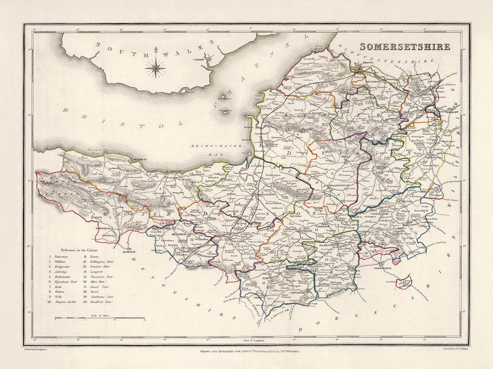 Faites un saut dans le temps avec cette captivante carte historique du Somerset, en Angleterre, soigneusement élaborée par Samuel Lewis en 1844. Ce morceau d'histoire est un véritable trésor pour les passionnés d'histoire, les cartographes et les amateurs de collections uniques et haut de gamme. Il offre un aperçu rare des premières colonies et des caractéristiques géographiques du comté de Somerset, dont certaines sont les ancêtres des villes modernes animées et des charmantes bourgades d'aujourd'hui.
