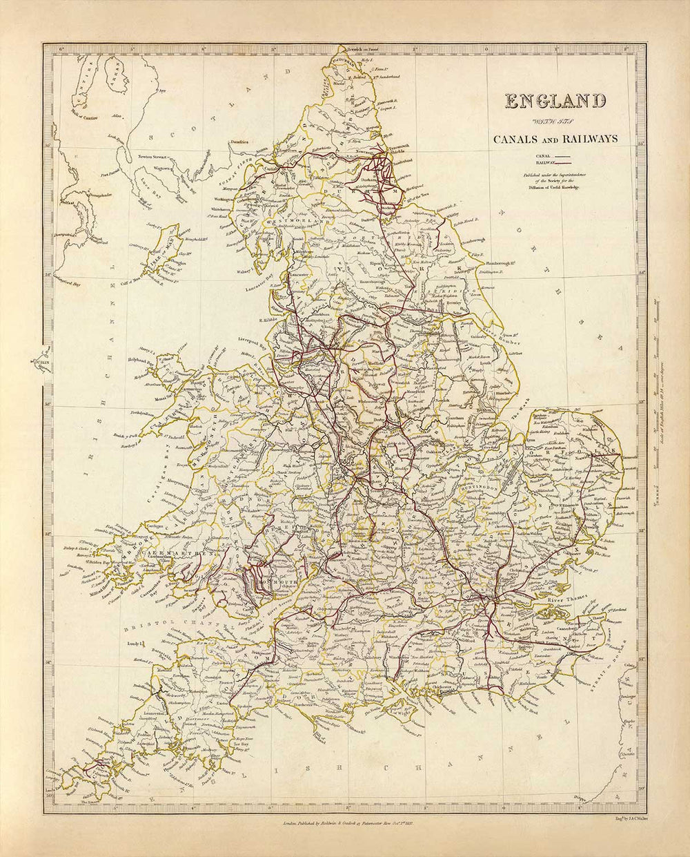 Ancienne carte des chemins de fer et des canaux en Angleterre et au Pays de Galles en 1837 par SDUK: Transport, Chemins de fer, Chemins de fer nationaux, Rivières