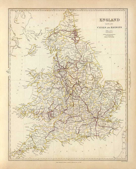 Cette merveilleuse vieille carte des chemins de fer et des canaux d'Angleterre et du Pays de Galles a été publiée pour la première fois en 1837. Elle a été créée par SDUK.