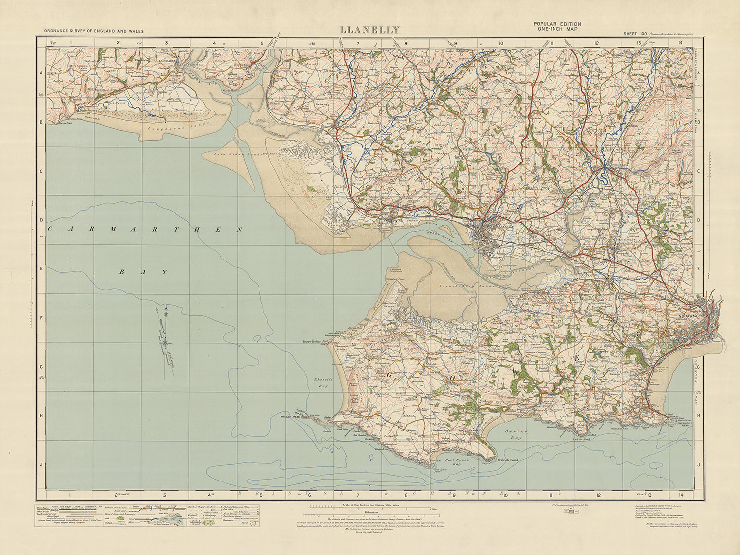 Carte Old Ordnance Survey, feuille 100: Llanelly, 1925 : Swansea, Mumbles, Burry Port, Kidwelly, Gower AONB