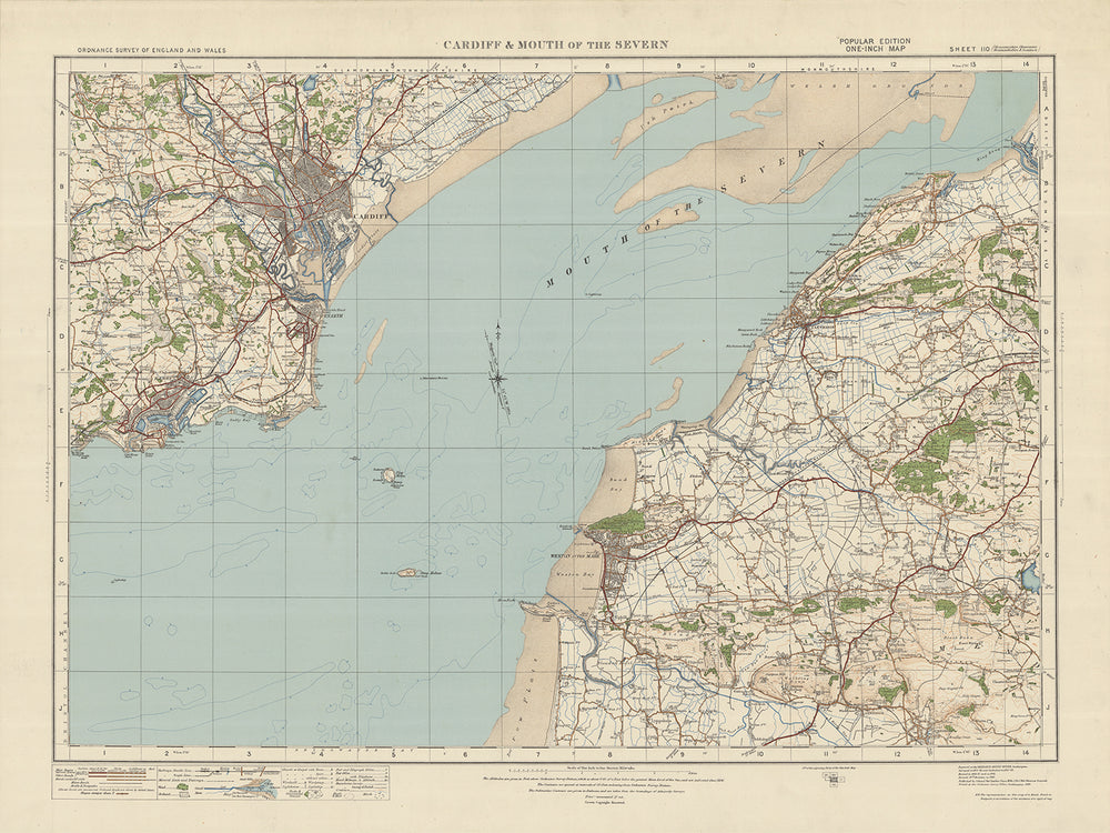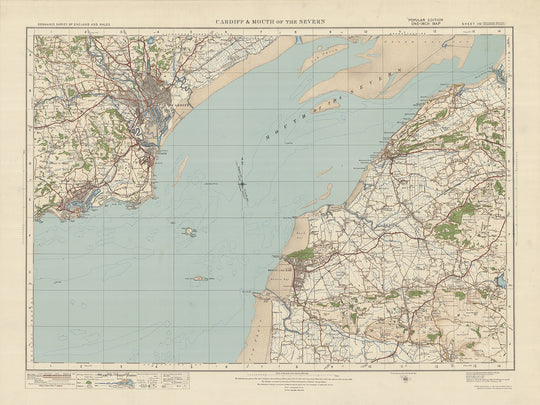 Cette ancienne carte de l'Ordnance Survey, feuille 110 - Cardiff et bouche de la Severn, publiée en 1925, offre un aperçu fascinant du passé, mettant en valeur les villes et les caractéristiques naturelles de la région. La carte couvre une zone qui comprend Cardiff, la capitale du Pays de Galles, et l'embouchure de la Severn, offrant une perspective unique sur le paysage et les établissements de l'époque.
