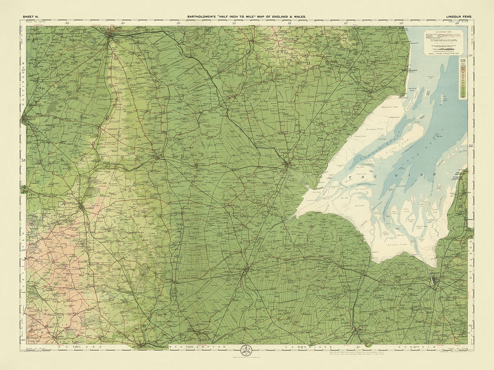 La carte est riche en caractéristiques notables, y compris la rivière Witham, la rivière Welland et la Fossdyke Navigation, qui ont joué des rôles cruciaux dans l'histoire et le développement de la région. The Wash, un large estuaire, est affiché en bonne place, avec ses bancs de sable et de gravier et ses marais salants environnants. Ces phénomènes naturels sont méticuleusement détaillés, reflétant l'engagement de Bartholomew envers l'exactitude et sa profonde compréhension du paysage. La carte présente également des infrastructures romaines anciennes, telles que le Car Dyke, ajoutant une couche de profondeur historique.