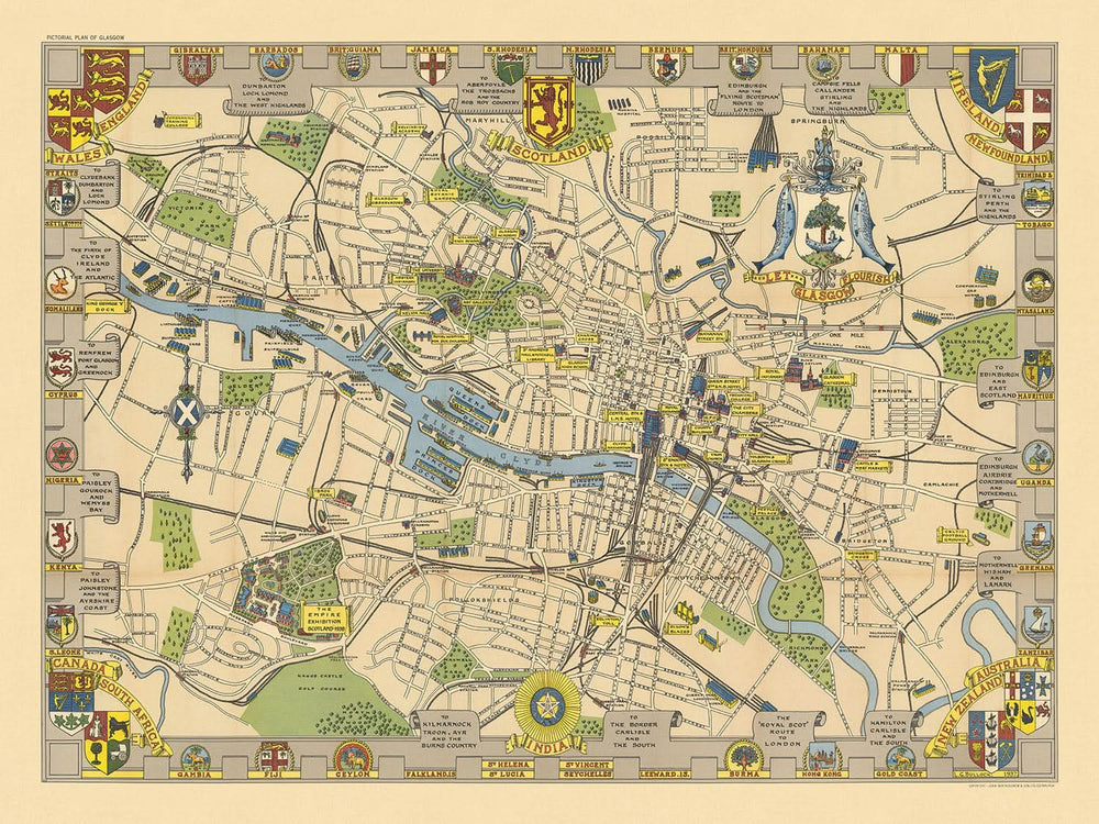 La carte détaille en détail les quartiers les plus importants de Glasgow, tels que Maryhill, Partick et Govan, chacun riche d'histoire et de caractère. Ces zones sont animées par le style pictural unique de Bullock, offrant un aperçu de la mosaïque urbaine du Glasgow des années 1930. L'inclusion de ces quartiers fournit non seulement un contexte géographique, mais célèbre également la diversité culturelle et le patrimoine industriel qui ont longtemps défini la ville.