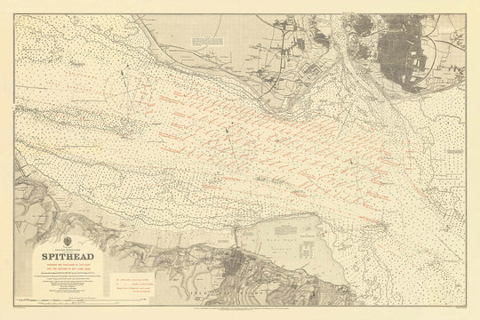 Ce qui distingue cette carte, c'est sa richesse en détails infographiques, méticuleusement gravés par Malby & Sons pour l'Amirauté britannique. Les eaux sont vivantes avec des sondages—des nombres indiquant les profondeurs d'eau en brasses—fournissant des informations vitales pour une navigation sûre. Les aides à la navigation telles que les roses des vents, les chenaux et les bouées sont soigneusement représentées, reflétant la fonction originale de la carte en tant qu'outil de travail pour les marins. Ces éléments s'assemblent pour créer un portrait dynamique et riche en données du Solent à l'aube du vingtième siècle.