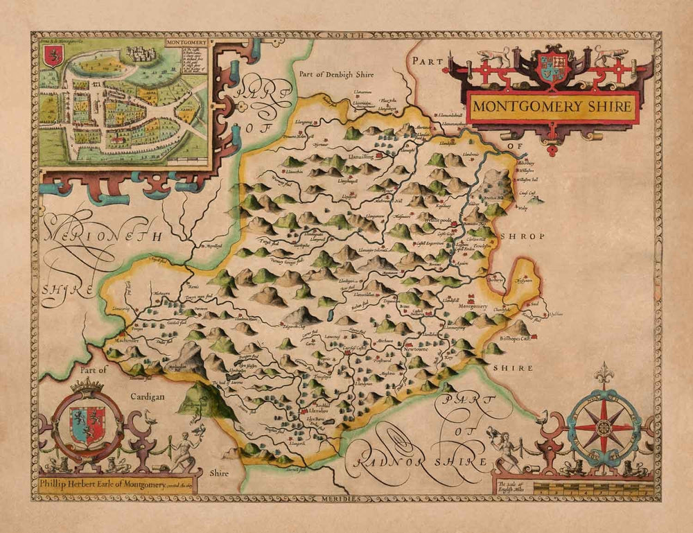 Beaucoup des villes, villages et cités de Montgomeryshire sont déjà visibles sur cette carte, y compris Montgomery, Newtown, Welshpool et Llanidloes. N'hésitez pas à m'envoyer un message si vous souhaitez confirmer si une certaine ville ou un village est sur cette carte.