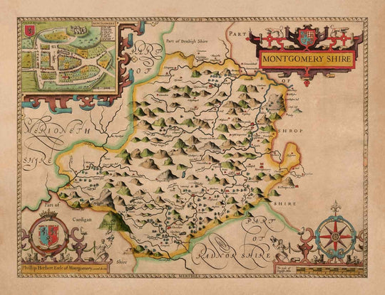 Ancienne carte du Montgomeryshire, Pays de Galles, 1611 par John Speed: Powys, Maldwyn, Montgomery, Newtown, Welshpool, Llanidloes