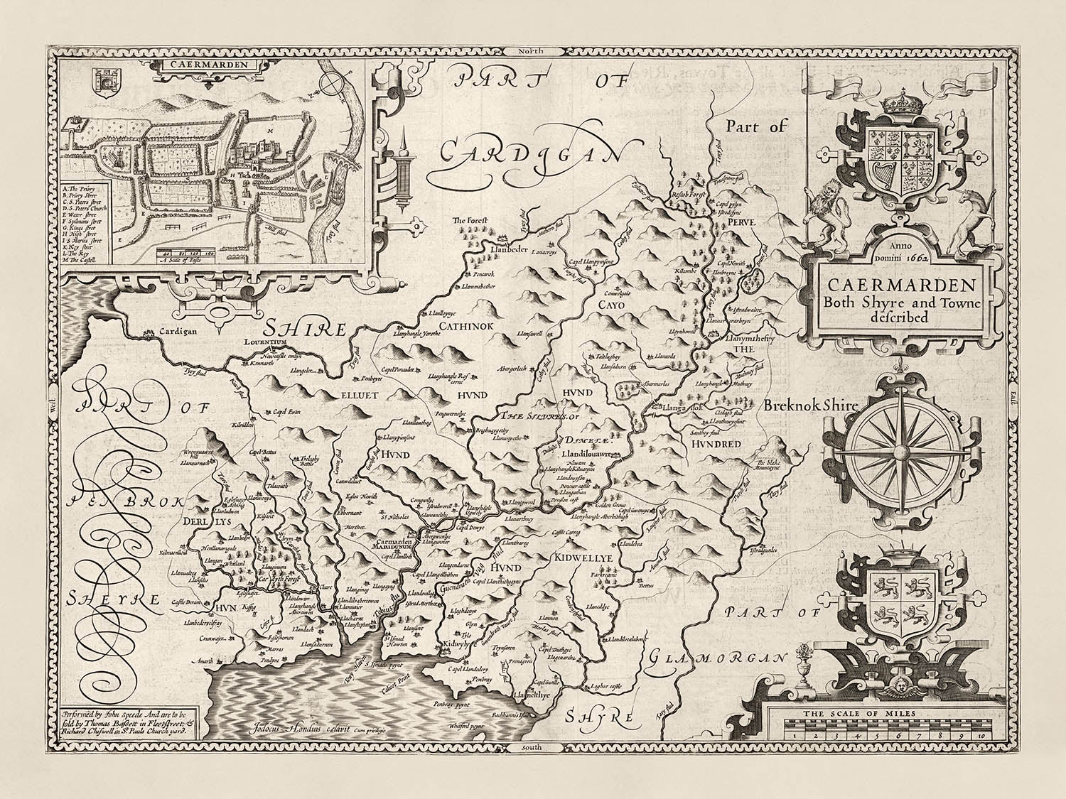 Old monochrome Carte of Carmarthenshire Wales, 1611 par John Speed - Carmarthen, Llanelli, Llandovery, Ammanford