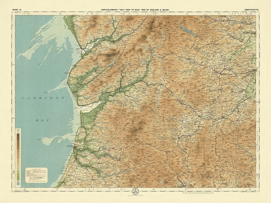 Le design de la carte est à la fois fonctionnel et artistique, avec une orientation paysage qui améliore sa lisibilité et son impact visuel. La subtile gradation des bandes de couleur pour montrer les terres à différentes hauteurs témoigne de l'habileté de Bartholomew et de son attention aux détails. Cette technique permet une compréhension nuancée du terrain, mettant en avant des caractéristiques telles que le Plynlimon, le point le plus élevé des montagnes cambro-ordoviciennes, et les vallées luxuriantes sculptées par les rivières de la région. La carte marque également des sites historiques significatifs, y compris les ruines de l'abbaye de Strata Florida et le célèbre Pont du Diable, ajoutant des couches de contexte culturel et historique aux informations géographiques.