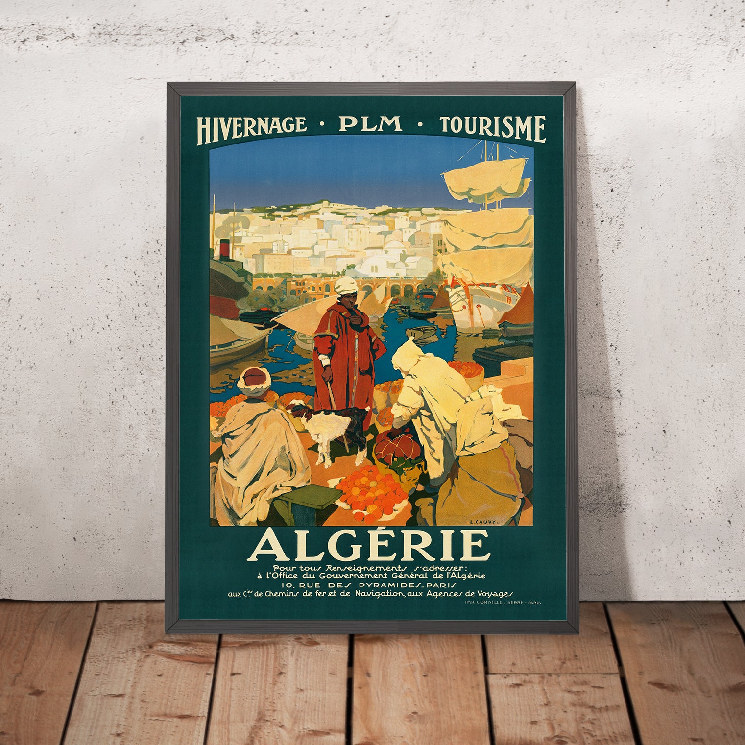Algérie by Léon Cauvy (1930) invites you into the sun-washed allure of North Africa at the height of the golden age of travel posters. Created in 1930, a moment when Algeria was being widely promoted to European travelers, this design distills a sense of warmth, light, and architectural romance into a single, striking composition. One of the most appealing aspects on first glance is the color: a radiant, sun-baked yellow floods the scene, punctuated by deep brick-red accents and cooled by blue-green shadows—an evocative palette that instantly conjures heat, spice, and sea-breeze evenings.