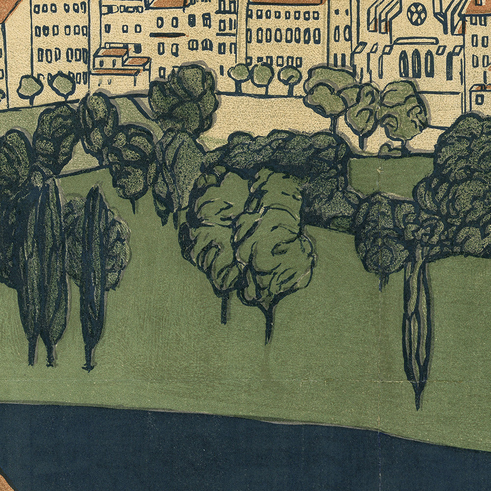 Bern – Schweiz, Switzerland, Suisse by Emil Cardinaux, first published in 1906, captures the Swiss capital at a moment when modern travel and graphic design were reshaping how people saw the world. Cardinaux’s view looks across Bern’s old town with its pale sandstone roofs and arcades, a sinuous blue sweep of the Aare River wrapping the peninsula while the slender spire of the Bern Minster punctuates the skyline. The composition is at once inviting and monumental, with crisp lettering and a tri-lingual legend that speaks to Switzerland’s multilingual character and cosmopolitan charm.