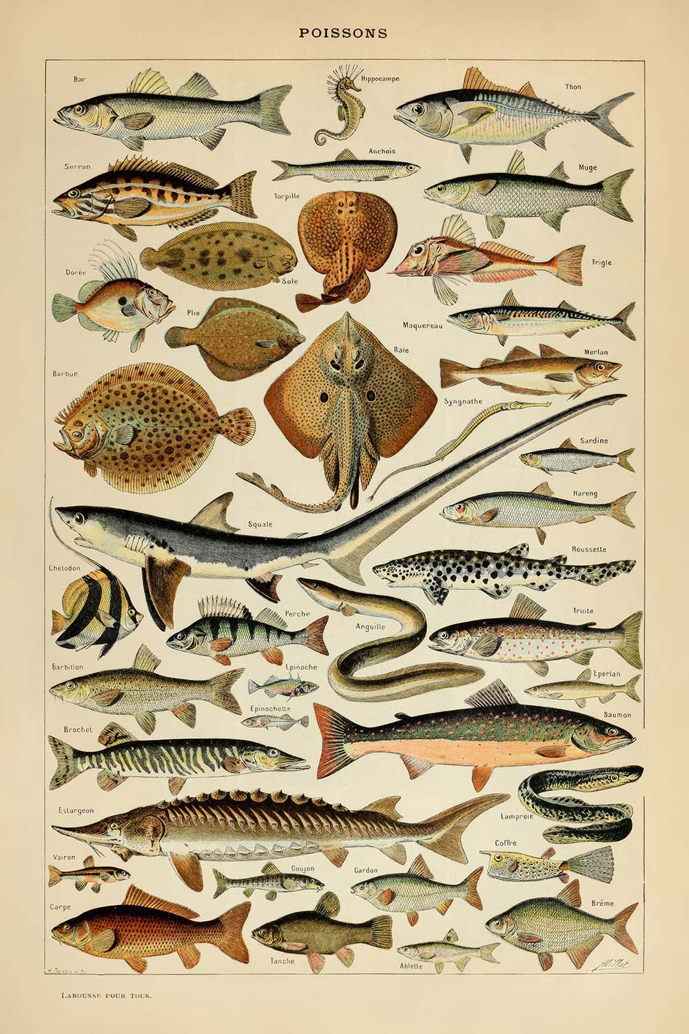 Cette illustration détaillée étiquette clairement une gamme d'espèces de poissons, chacune représentée et identifiée avec précision par leurs noms communs en français. Les espèces présentées incluent le Tur (Trichiurus lepturus), Esturgeon (Acipenser sturio), Anchois (Engraulis encrasicolus), Muge (Chelon labrosus), Sole (Solea solea), Plie (Pleuronectes platessa), Maquereau (Scomber scombrus), Hareng (Clupea harengus), Barbot (Cottus gobio), Raie (Raja clavata), Sardine (Sardina pilchardus), Châtillon (Leuciscus cephalus), Squale (Squalus acanthias), Perche (Perca fluviatilis), Aiguillette (Belone belone), Roussette (Scyliorhinus canicula), Saumon (Salmo salar), Barbue (Scophthalmus rhombus), Brochet (Esox lucius), Anguille (Anguilla anguilla), Truite (Salmo trutta), Éperlan (Osmerus eperlanus), Carpe (Cyprinus carpio), Carassin (Carassius carassius), Carpeau (Carassius auratus), et Tanche (Tinca tinca). Cette collection soigneusement présentée offre une référence visuelle informative à ces poissons marins et d'eau douce notables.