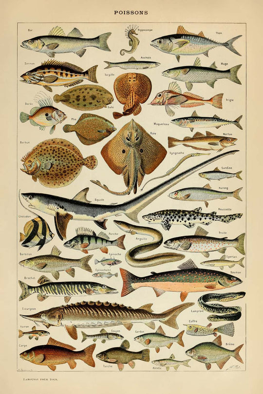 Rendue dans une palette dominée par des bleus doux, des verts atténués et des tons terreux délicats, l'illustration dégage une qualité tranquille et intemporelle. Les lignes délicates et l'ombrage subtil de Millot donnent vie à chaque poisson, tandis que l'agencement soigné crée un sens d'harmonie et d'ordre. Cette œuvre est parfaite pour quiconque a une passion pour l'histoire naturelle, la vie aquatique ou l'art victorien, et sa composition élégante en fait un ajout sophistiqué à tout intérieur.