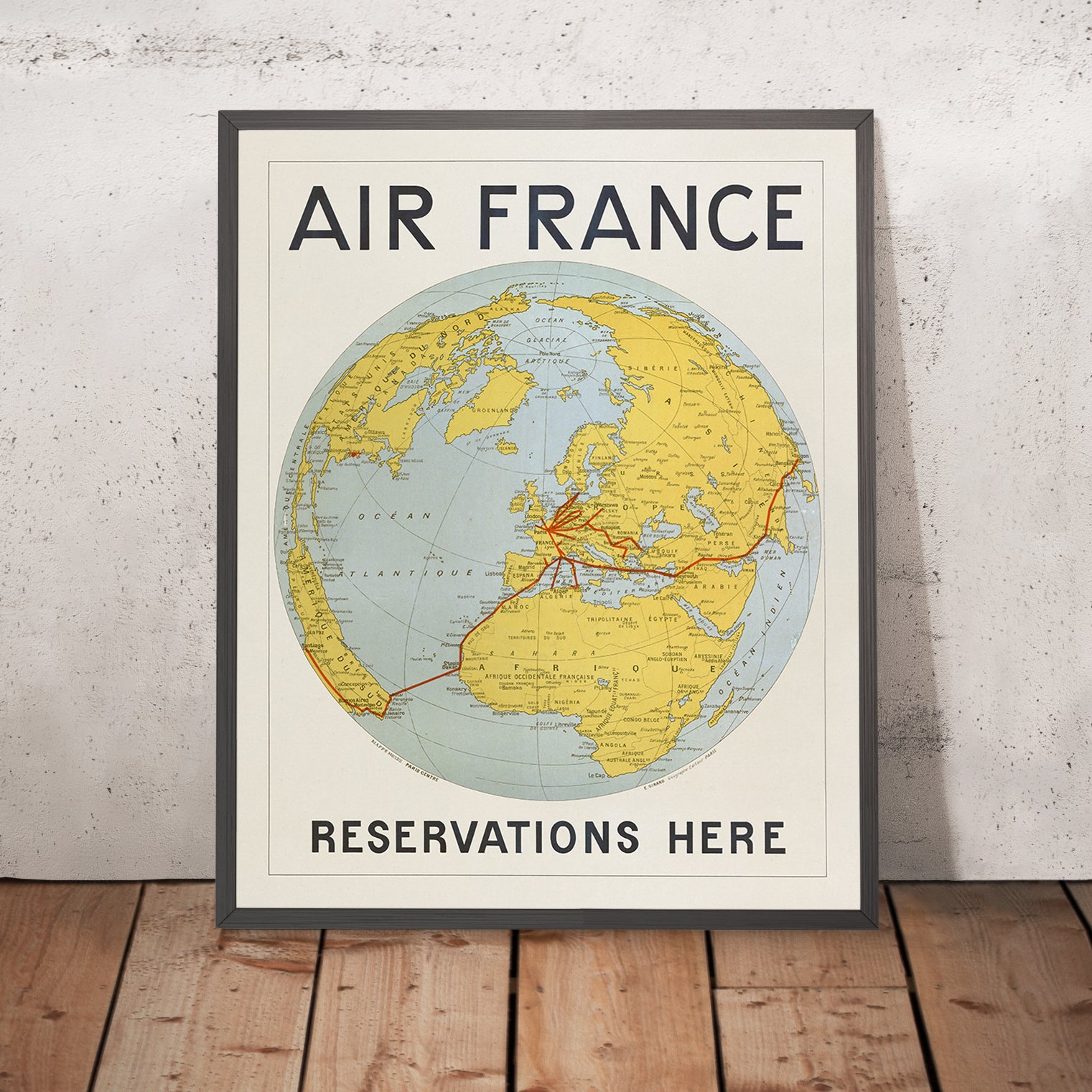 Why this artwork matters: Created in 1933—the year Air France emerged from a merger of several carriers—this poster is both advertisement and historical milestone. It reflects the shift from romantic, painterly travel scenes to direct, service‑oriented communication: a brand name, a promise of reservations, and an implicit invitation to the world. Pieces like this would have appeared in agency windows across Europe, making the dream of international flight feel immediate and attainable.