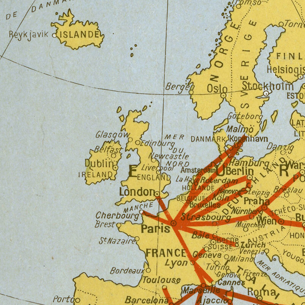Colour, style, and why you’ll love it: The design’s sun‑washed yellow field radiates warmth, while the deep blue type supplies striking contrast and brand authority; soft beige notes add a vintage, tactile calm that works beautifully in contemporary interiors. Its minimalist layout—no busy vignettes, just confident lettering and layout—embodies the streamlined visual language of Art Deco travel graphics. The result is a timeless statement piece that pairs easily with modern furniture, natural woods, or mid‑century accents and delights anyone with a taste for aviation heritage.