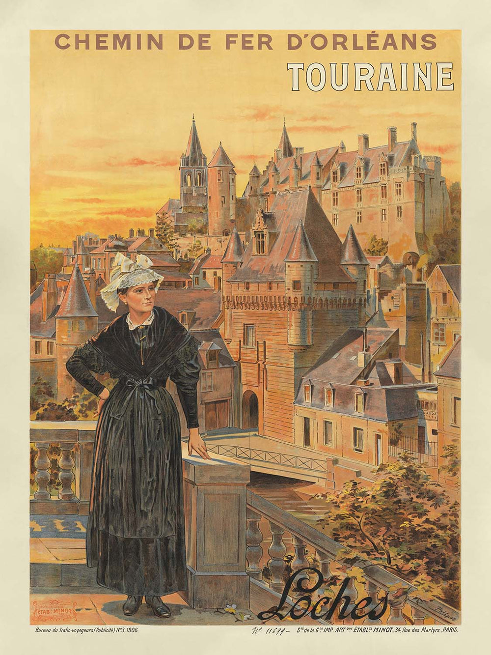 Chemin de Fer d’Orléans. Touraine, Loches (1906) by Établissements Minot captures the Belle-Époque romance of rail travel to the Loire Valley. Commissioned by the Chemin de Fer d’Orléans to promote excursions to the medieval town of Loches in Touraine, the poster presents a golden, late-afternoon view of the citadel’s turrets and steep slate roofs. In the foreground, a fashionably dressed traveler in a black walking dress rests a gloved hand on a stone balustrade, while the sky glows in saffron and apricot tones—an evocative promise of sunshine, history, and easy access by rail.