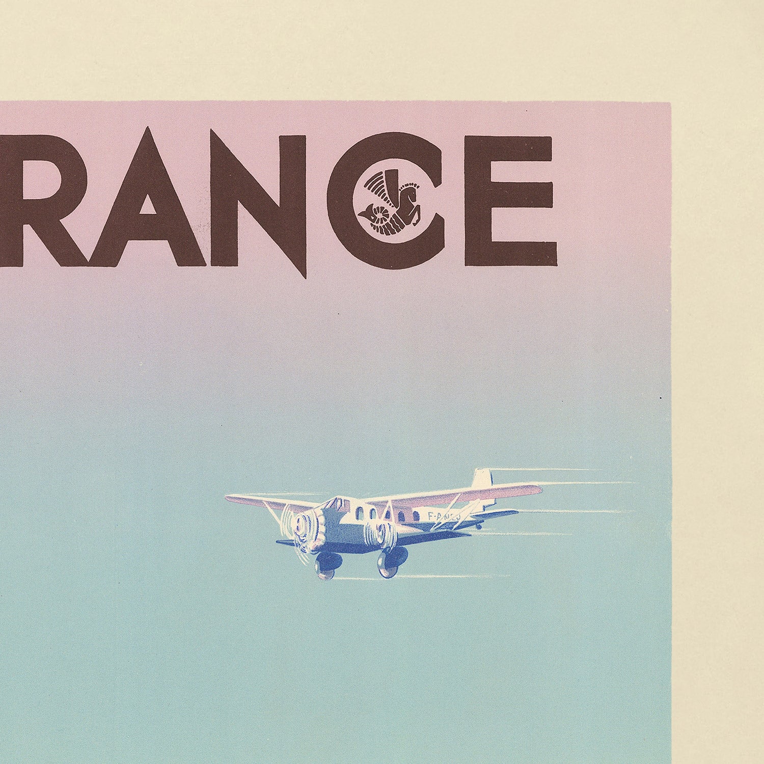 Air France – North Africa by plane by Maurice Guiraud-Rivière (1935) invites you into the golden age of aviation, when sleek aircraft stitched Paris to the sunlit cities of Morocco, Algeria, and Tunisia. In this elegant travel poster, a streamlined Air France airliner glides across a vast gradient sky while a red-walled city and palm-lined road lead toward a tall brick minaret, with the snow-capped Atlas Mountains shimmering on the horizon. Note the wonderful detail of Air France’s winged seahorse nestled inside the letter C of FRANCE and the robed figure at right wearing a boldly striped burnous—details that instantly anchor the scene in North Africa.