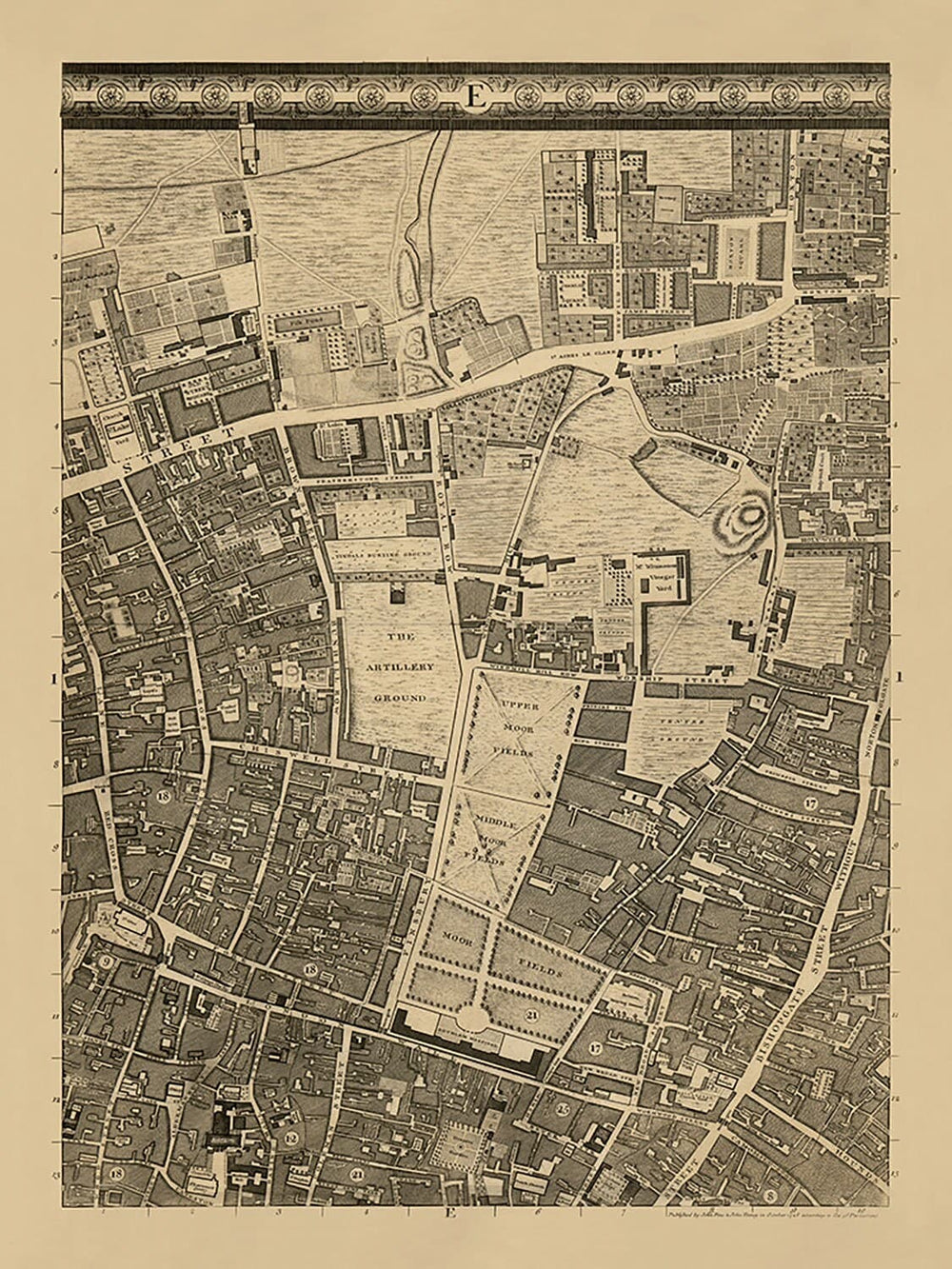 Cette carte a été initialement publiée en 24 feuilles. La carte montrée ici est la feuille E1, couvrant à peu près la zone entre Moorgate, Finsbury et Old Street dans le centre-nord de Londres.