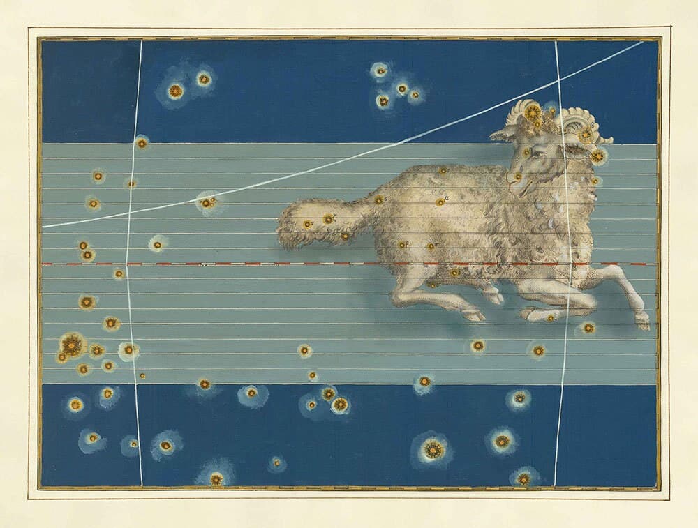 Cette carte des étoiles a été publiée pour la première fois en 1603 dans "Uranometria" de Johann Bayer, peut-être l'atlas stellaire le plus influent jamais publié et le précurseur de tous les atlas stellaires modernes. Il contenait 51 cartes des étoiles très précises, dont 48 étaient les constellations ptolémaïques. Et, bien sûr, les 12 signes majeurs du Zodiaque, y compris ce joli Bélier, étaient tous inclus.
