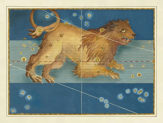 Cette carte des étoiles a été publiée pour la première fois en 1603 dans "Uranometria" de Johann Bayer, peut-être l'atlas des étoiles le plus influent jamais publié et le précurseur de tous les atlas modernes. Il contenait 51 cartes des étoiles très précises, dont 48 étaient les constellations ptolémaïques. Et, bien sûr, les 12 signes majeurs du zodiaque, y compris ce joli Lion, étaient tous inclus.