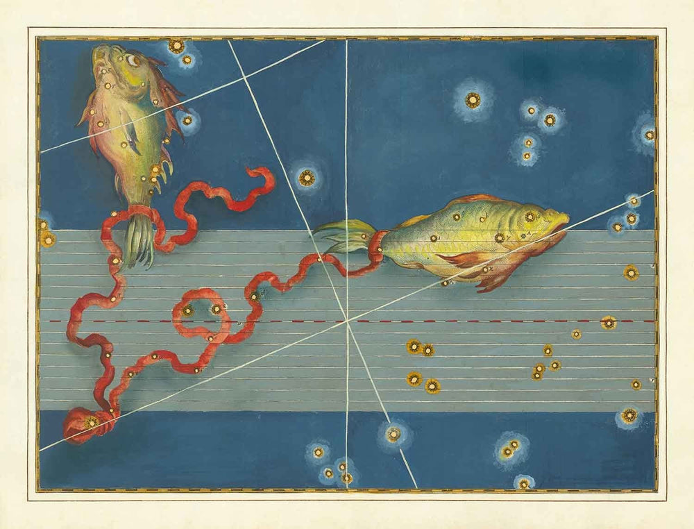 Cette carte des étoiles a été publiée pour la première fois en 1603 dans "Uranometria" de Johann Bayer, peut-être l'atlas des étoiles le plus influent jamais publié et le précurseur de tous les atlas modernes. Il contenait 51 cartes d'étoiles très précises, dont 48 étaient les constellations ptolémaïques. Et, bien sûr, les 12 signes majeurs du Zodiaque, y compris ce joli Poissons, étaient tous inclus.