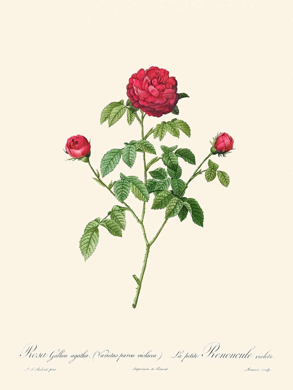 Originaire de Belgique, Redouté a commencé sa brillante carrière en tant que professeur de peinture auprès de Marie-Antoinette avant de se plonger dans le monde de l'illustration botanique. À partir de 1798, au château de Malmaison, il s'est lancé dans un projet ambitieux, réalisant plus de 2 100 tableaux représentant plus de 1 800 espèces végétales. Cette remarquable entreprise a consolidé son statut de maître du genre, et « Les Roses », la série dont est issue cette illustration, reste saluée pour son excellence.