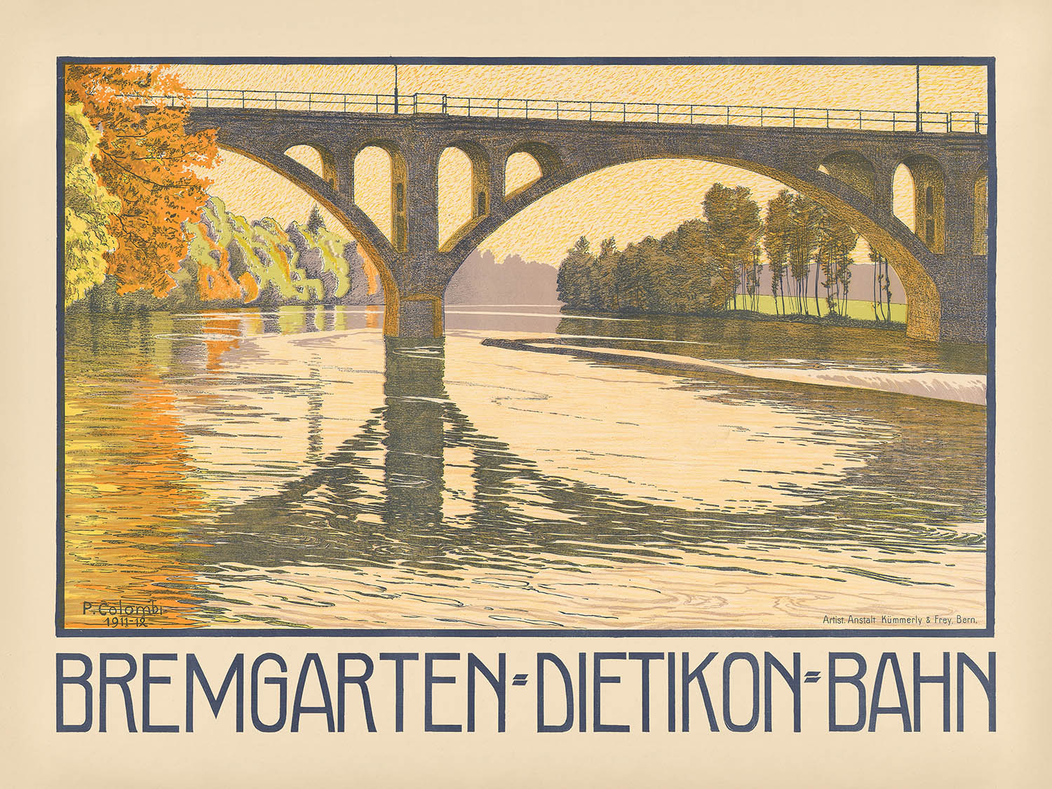 Bremgarten-Dietikon-Bahn by Plinio Colombi (1912) is a luminous Swiss travel poster celebrating the scenic rail link between Bremgarten and Dietikon. A broad arched bridge strides across a quiet river, its ribs and cut‑outs mirrored in the water below while autumnal trees blaze at the left bank. Colombi’s elegant hand signs the scene in the lower left, and the title “Bremgarten–Dietikon–Bahn” runs in tall blue lettering across the lower panel—classic hallmarks of early Swiss poster design that invite you to step aboard for a sunlit journey through the Aargau and Limmat valley region.