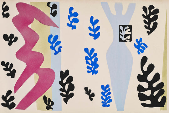 L'œuvre se distingue par sa palette de couleurs distincte dominée par des roses vifs, des bleus harmonieux et des noirs frappants. Matisse démontre sa capacité à évoquer l'émotion et le mouvement à l'aide de formes découpées qui transcendent les définitions traditionnelles de l'espace et de la ligne. Cette expérience esthétique unique souligne pourquoi posséder une impression de cet art enrichirait n'importe quelle collection.