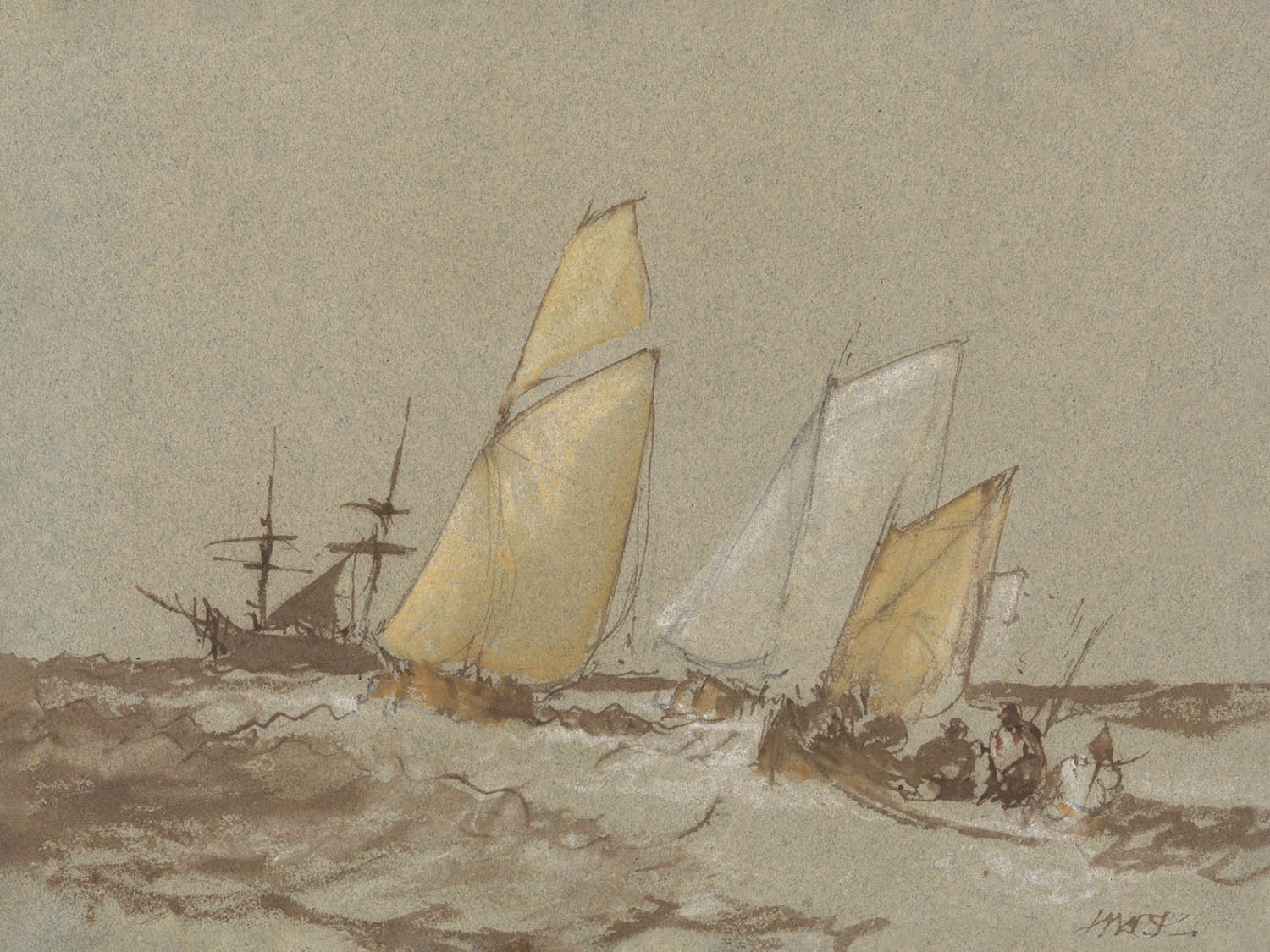 Le style distinctif de Turner se caractérise par de riches couches de peinture à l'huile qui créent des effets atmosphériques scintillants - vus ici alors que les navires se dissolvent dans leur cadre brillant. La lumière dynamique de cette impression, les formes de nuages tourbillonnants et la mer lustrée feront un ajout frappant à toute collection, en particulier pour les amateurs d'histoire nautique, d'art britannique ou de styles picturaux audacieux.