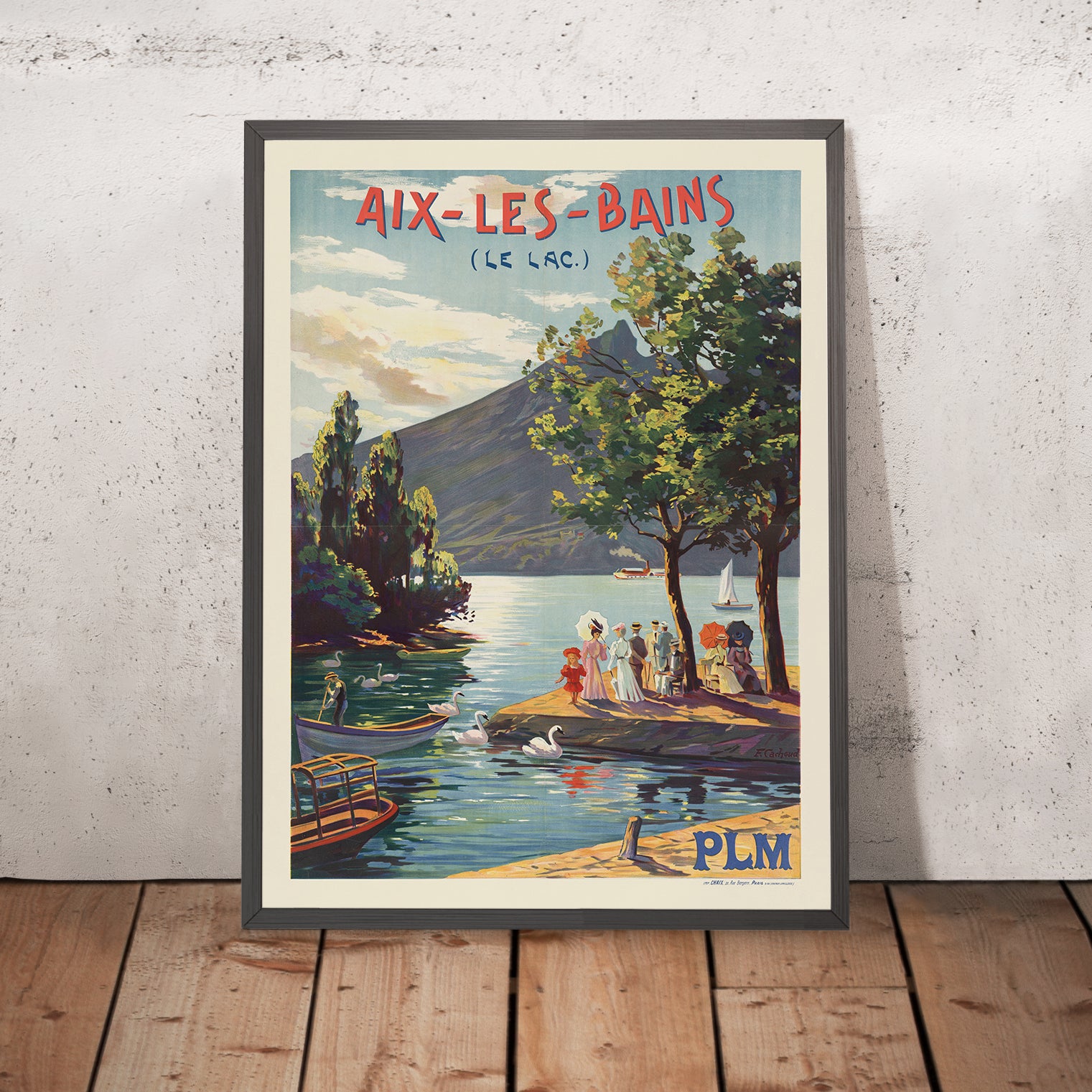 This artwork is notable for how it crystallizes the romance of travel to Aix‑les‑Bains: the promise of restorative waters, clear mountain air, and leisurely days by the lake. The composition places the viewer on a shaded overlook, suggesting the cool refuge of the forest before stepping into the sunlit openness of the bay. It speaks to the interwar and Belle Époque taste for elegant, restorative destinations—places where wellness and scenic grandeur met.