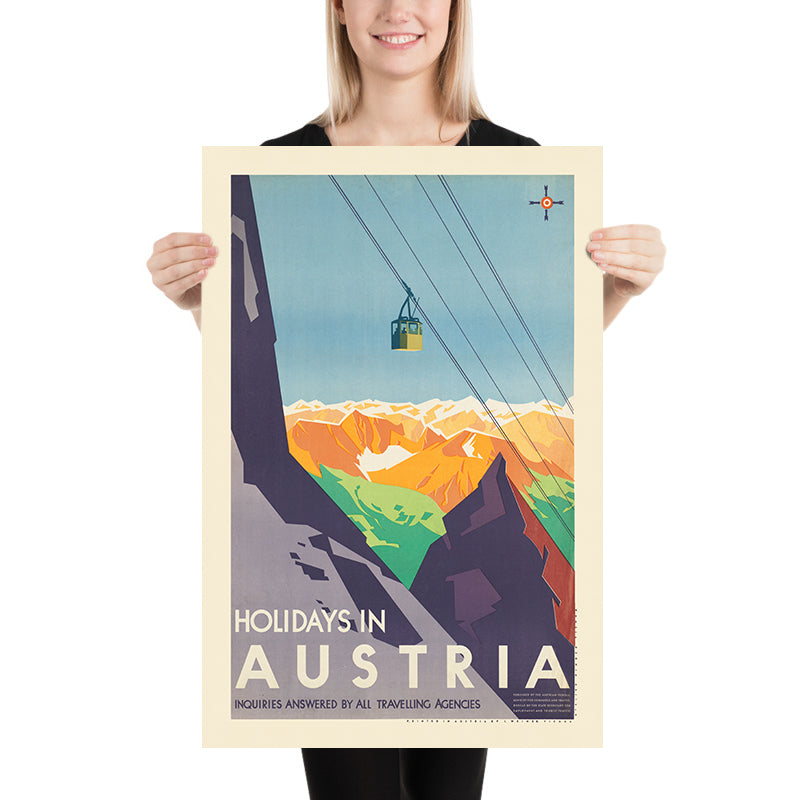 This poster’s subject—holidays in the Austrian high country—speaks to a pivotal moment in European leisure culture. As railways, cable cars, and improved roads opened the Alps to travelers, tourism boards embraced fresh, forward-looking graphics to communicate ease, glamour, and healthy outdoor living. Here, the suggestion of an aerial tramway underscores technological progress, while the monumental mountains evoke a nation defined by its peaks, clean air, and crystalline light.