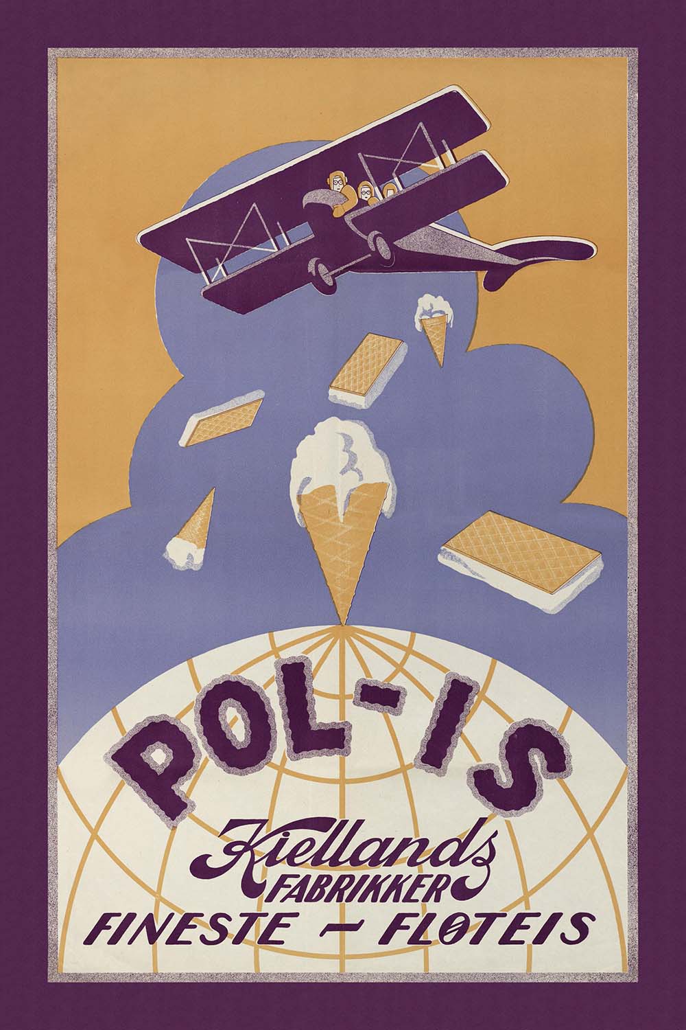 Pol-is ; fineste – fløteis is a striking Art Deco–era poster by an anonymous Scandinavian commercial artist, celebrating the joy of ice cream with the glamour of modern travel. With its Norwegian wording (“fløteis” meaning rich cream ice cream) and aviation motif, the design evokes interwar optimism—when flight, refrigeration, and sleek styling promised a brighter, more connected world. A streamlined airplane arcs over a gridded globe while jubilant scoops rise like suns, turning a simple treat into a passport to delight.